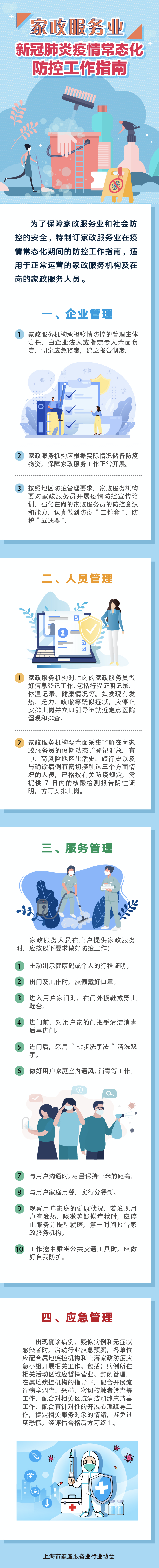 为做好家政服务业常态化疫情防控工作,上海市家庭服务业行业协会在市商务委及市健康促进中心的指导下,发布《家政服务业疫情防控工作指南》图解版。家政服务人员在上户提供服务时,应主动出示健康码或行程证明。详见↓