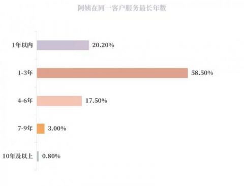 阿姨来了平台上的阿姨职业稳定性较好,数据显示,58.5%的阿姨在同一雇主家服务1-3年时间,21.3%的阿姨在同一雇主家服务长达4年以上。受访者蒋玉莲阿姨稳定服务同一雇主10年之久。与往年数据相比,职业稳定性有了很好改善,展现了我国家政行业职业化发展的良好势头。