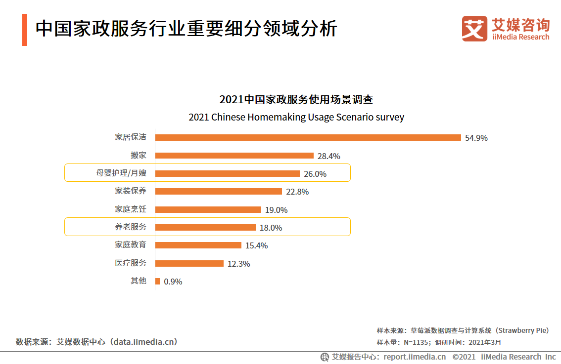 今年起,国家正式实施“三孩”政策,预计将会出现一波“三孩”小高峰。根据调查数据,母婴护理月均服务消费支出水平在家政服务当中是相当高的,月均消费在10000元以上的用户占比38.2%,16000元以上占比7.1%。“三孩”政策实施之后,母婴护理方面的家政需求只会有增无减。