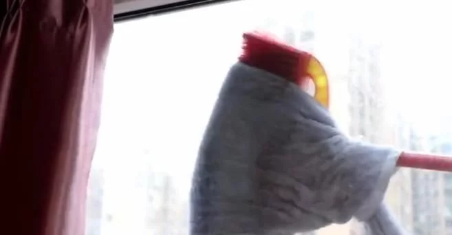 然后拿扫把伸到窗户外面,擦那些脏的地方。窗户外面的灰尘都可以擦的干干净净。像那些窗户死角的地方也可以擦的干干净净。