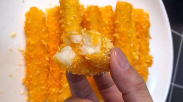 第七步:老三样,用牛奶条沾一层鸡蛋液,最后裹一层万能面包糠,这两样的组合,不管什么食材出来都是极其美味的,外焦内软,不要太好吃。